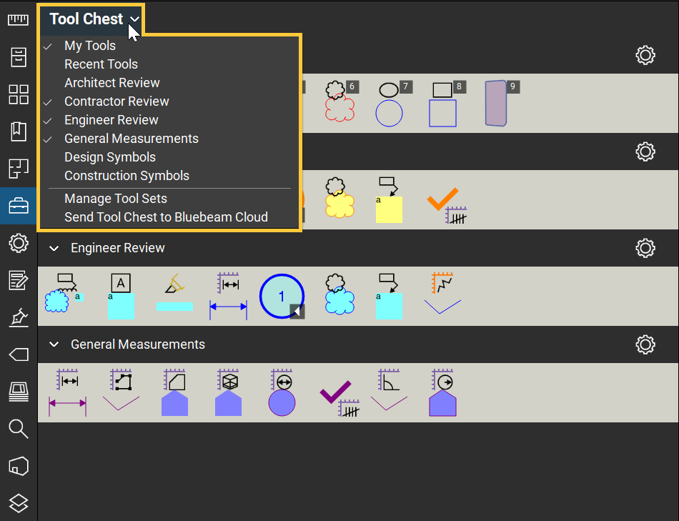 عند فتح لوحة Tool Chest، ستجد بعض مجموعات الأدوات المحمّلة مسبقًا التي يأتي بها Revu. تُستخدم هذه المجموعات بشكل خاص لـ "مراجعة التصميم" و"حصر الكميات"، بالإضافة إلى الرموز الأخرى الشائعة في صناعة الهندسة المعمارية والبناء والبنية التحتية (AEC). كما يمكنك أيضًا إنشاء مجموعات أدوات مخصصة تناسب احتياجاتك الشخصية.